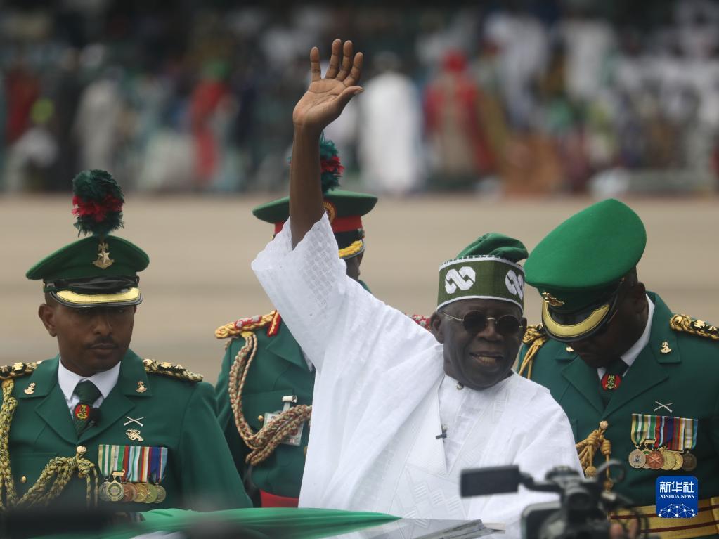 5月29日,尼日利亞新總統(tǒng)博拉·提努布在首都阿布賈舉行的閱兵儀式上揮手致意。