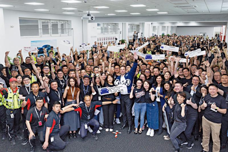 圖:5月31日晚,馬斯克(前排中)在上海的特斯拉工廠與人們合影。\路透社