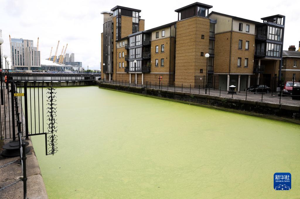 由于當?shù)貧鉁厣叩仍?,英國倫敦泰晤士河畔碼頭的一處水域被浮萍覆蓋。