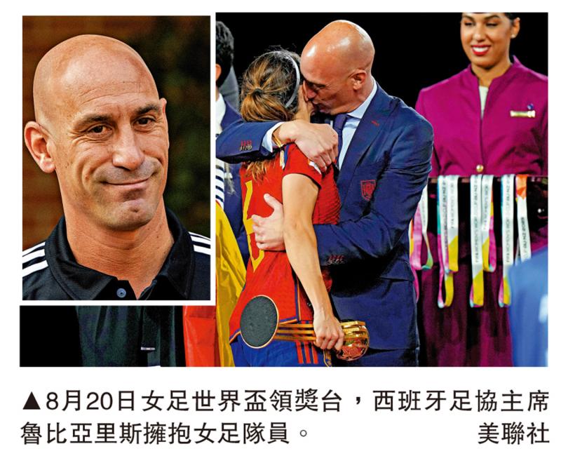 8月20日,西班牙女足1比0擊敗英格蘭,在女足世界杯中奪冠。在頒獎禮上,魯比亞里斯抱住球員靴莫素,并嘴對嘴強吻。該舉惹眾怒,質(zhì)疑有性騷擾之嫌,并引發(fā)了對體育界性別歧視的質(zhì)疑。