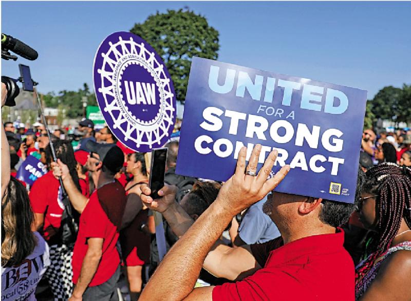 圖:汽車工人聯(lián)合會(huì)成員4日在底特律參加集會(huì)。\法新社