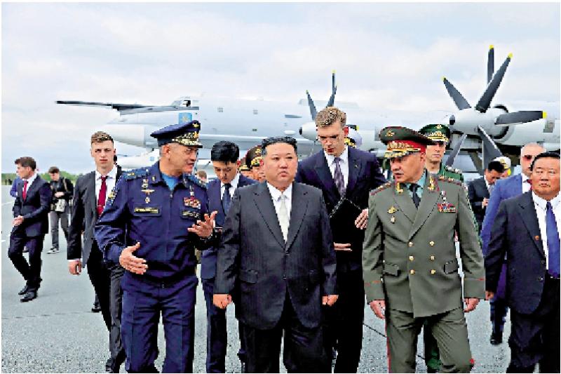 圖:金正恩(中)16日與紹伊古(右二)會面。\法新社
