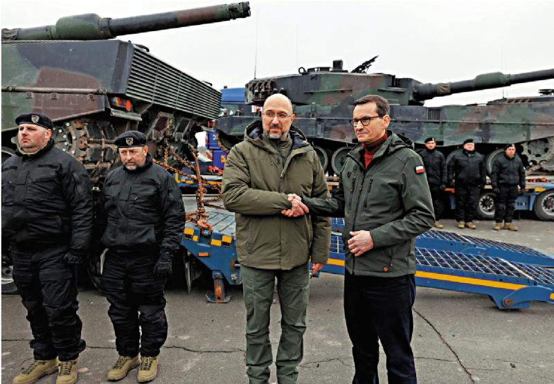 圖:烏克蘭總理什米哈爾(左)和波蘭總理莫拉維茨基(右)2月24日在波蘭交付的首批豹2型坦克旁合影。\路透社