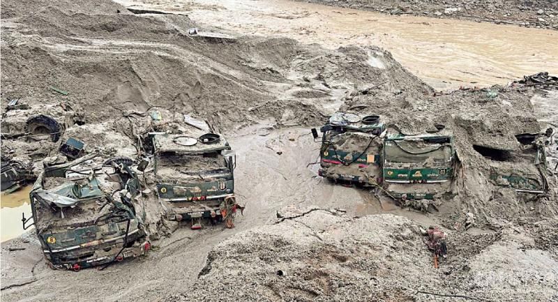 圖:印度東北部錫金邦4日發(fā)生山洪,多輛貨車被洪水卷來的泥沙掩埋。\路透社