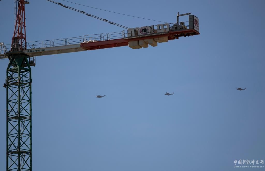 巴以新一輪武裝沖突的第一天,軍用直升機(jī)在耶路撒冷上空盤旋。