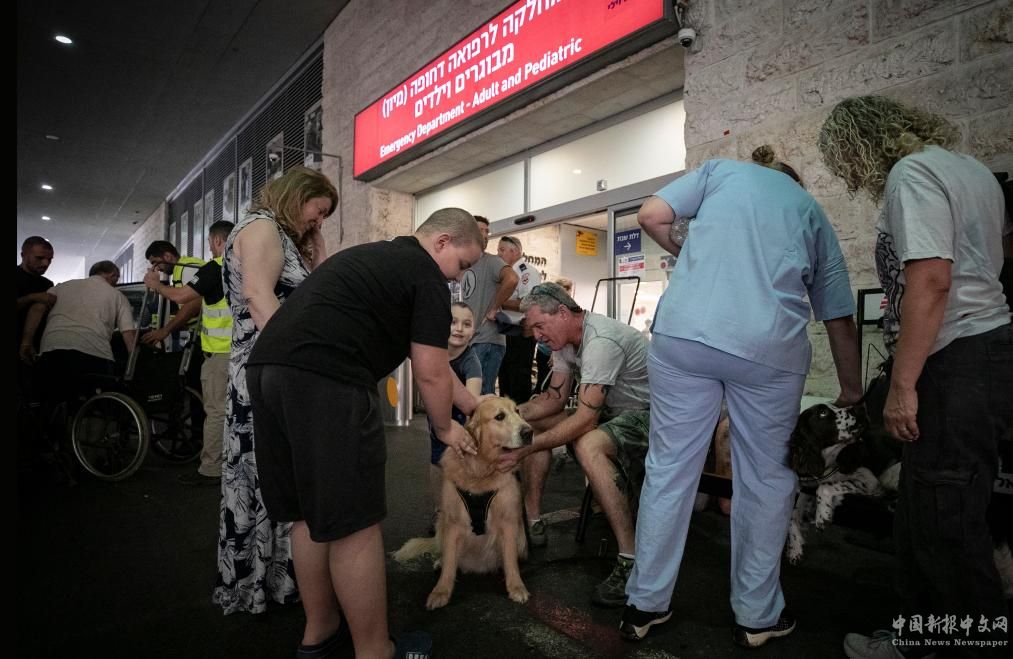 巴以新一輪武裝沖突后的第三天,在以色列邊境城市阿什凱隆一家收治前線傷員的醫(yī)院,經(jīng)過訓(xùn)練的心理治療犬正提供服務(wù)。
