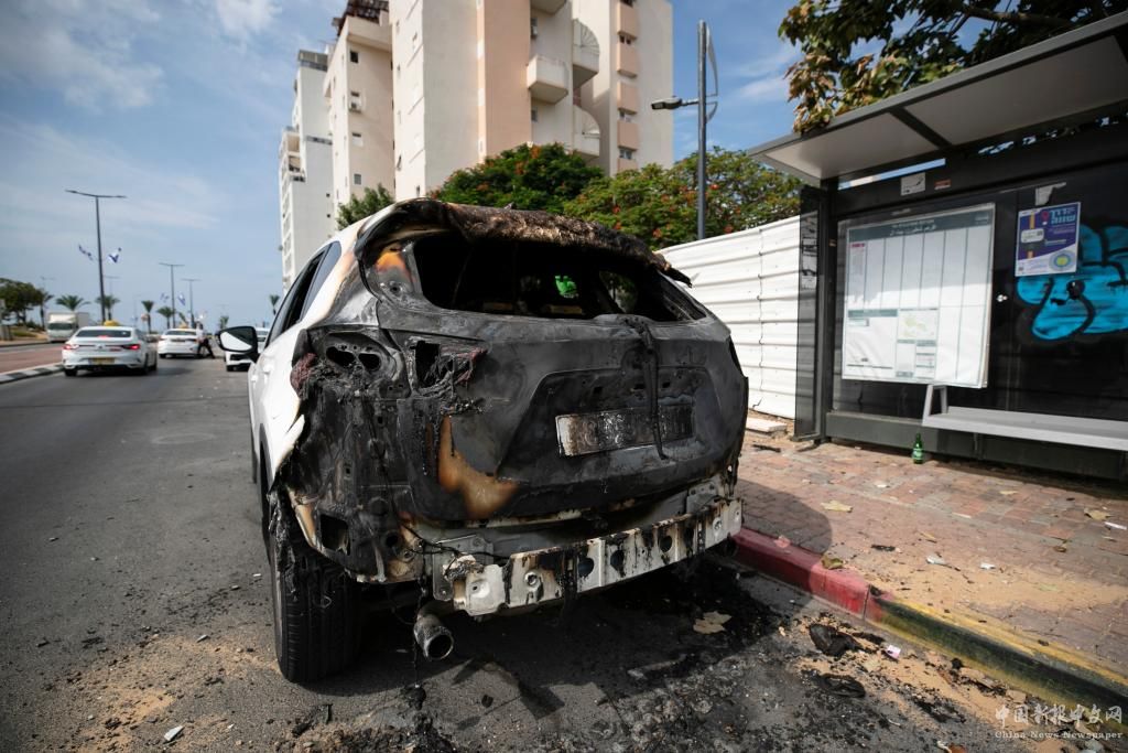 巴以新一輪武裝沖突后的第三天,在以色列邊境城市阿什凱隆,一輛汽車遭到火箭彈破壞。