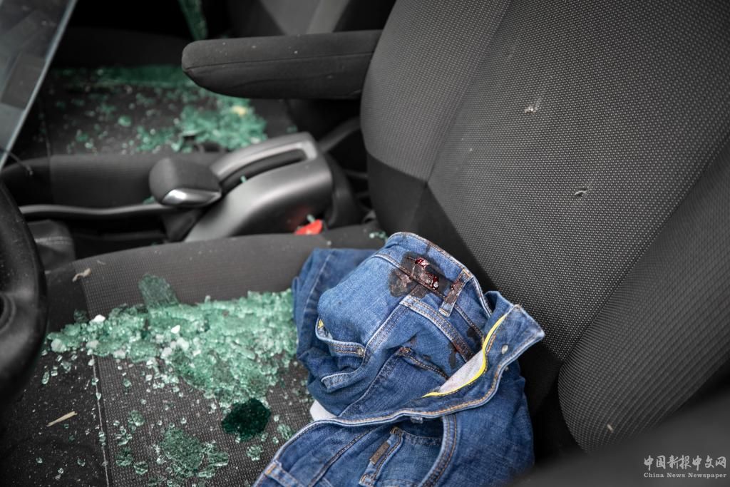 巴以新一輪武裝沖突后的第三天,在以色列邊境城市阿什凱隆,在一輛剛遭到火箭彈襲擊的車輛上,沾有血跡的牛仔褲在駕駛座上。