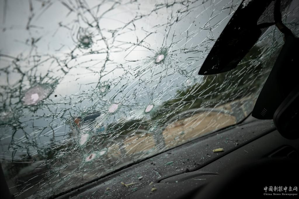 巴以新一輪武裝沖突后的第三天,在以色列邊境城市阿什凱隆,一輛汽車剛剛遭到火箭彈襲擊。