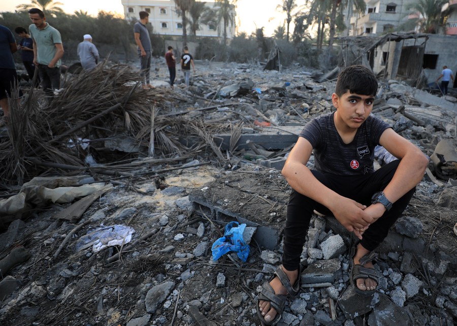 10月23日,在加沙地帶南部城市汗尤尼斯,一名男孩坐在遭以色列空襲后的建筑廢墟上。新華社發(fā)(亞西爾·庫(kù)迪攝)