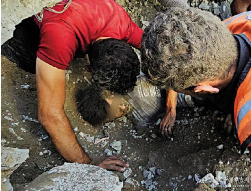 圖:賈巴利亞難民營遇襲后,民眾在廢墟中搶救傷員。\路透社