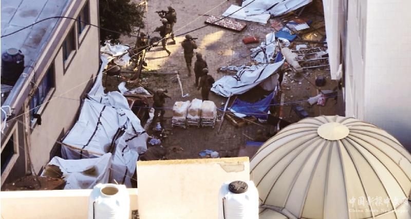 圖:以軍士兵15日進(jìn)入希法醫(yī)院內(nèi)。\路透社
