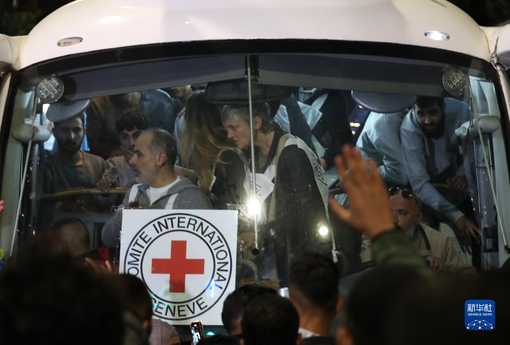 11月26日,載有獲釋巴勒斯坦被關(guān)押人員的大巴抵達(dá)約旦河西岸城市拉姆安拉。