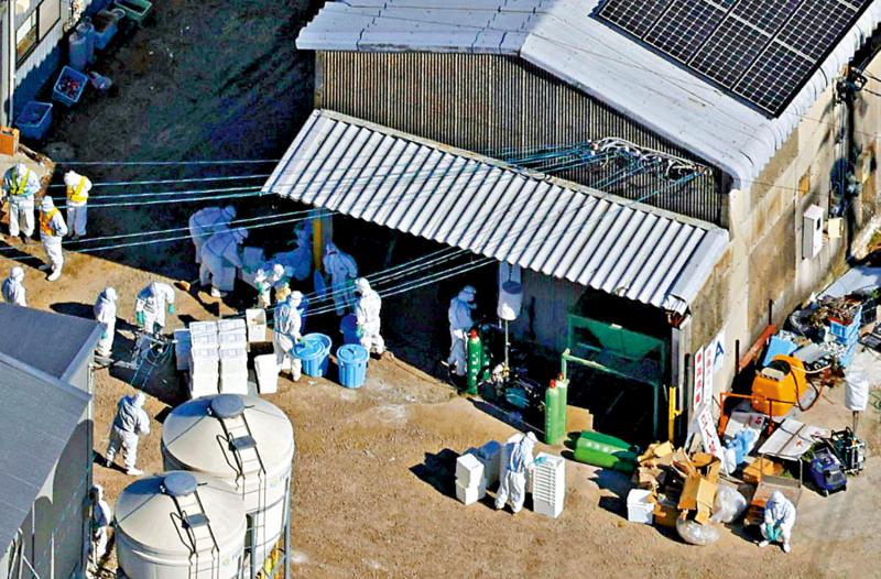 圖:工作人員25日在佐賀縣鹿島一家養(yǎng)雞場(chǎng)撲殺約4萬(wàn)只雞。\路透社