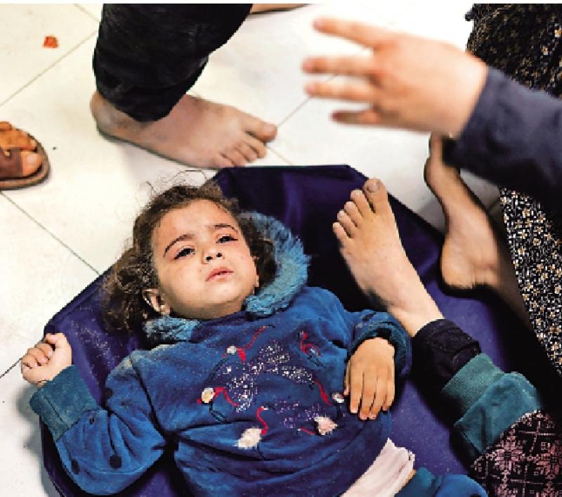 圖:一名巴勒斯坦兒童躺在加沙納賽爾醫(yī)院的地板上。\路透社