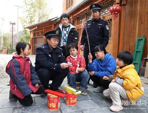 1月11日,民警在給孩子們講解煙花爆竹安全燃放知識及注意事項。連日來,湖南省保靖縣公安局組織民警深入鄉(xiāng)村,開展“群眾的110,守護(hù)春節(jié)平安”主題宣傳活動,向中小學(xué)生們講解110報警常識,手把手教他們?nèi)挤艧熁ū竦恼_方法,及冬季消防安全等知識,提高孩子們的安全意識和自我保護(hù)能力,確保他們度過一個安全、快樂的假期。(俞采華  石   磊)