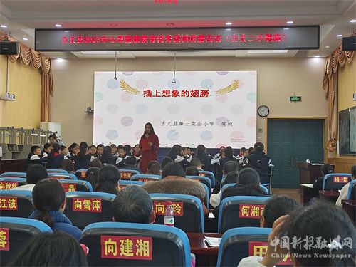 3月28日上午,優(yōu)秀課例研磨活動在古丈縣第二完全小學老塘坊校區(qū)大會議室舉行??h教體局相關(guān)股室負責人、教研員,城區(qū)小學校長及領(lǐng)導班子,楊菊花心理健康名師工作室成員,二小的老師們匯聚一堂,認真聆聽鄒姣老師的優(yōu)秀課例——《插上想象的翅膀》。首席名師楊菊花運用鮮活的案例將心育所得與老師們分享,手把手教老師們?nèi)绾紊虾眯睦斫】到逃n,受到與會人員的高度評價——這是一堂精彩的接地氣的講座。講座之余,優(yōu)課研磨活動繼續(xù),工作室成員積極研討,通力合作,把這堂心理健康課又推上了一個新臺階。