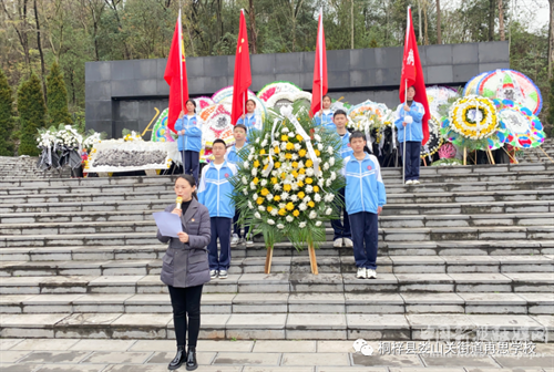 學(xué)生代表向烈士敬獻(xiàn)花籃,在革命烈士墓碑前,全體師生懷著沉重的心情低頭默哀三分鐘。