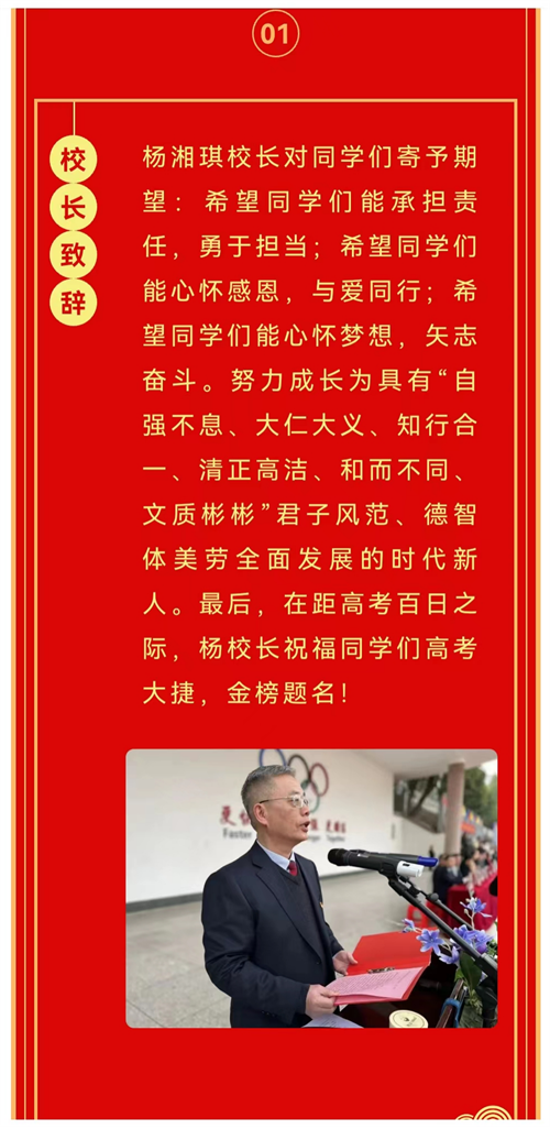 原校長、現(xiàn)任書記楊湘琪對同學(xué)們寄予期望:希望同學(xué)們能承擔(dān)責(zé)任,勇于擔(dān)當(dāng);希望同學(xué)們能心懷感恩,與愛同行;希望同學(xué)們能心懷夢想,矢志奮斗。努力成為具有“自強(qiáng)不息、大仁大義、知行合一、清正高潔、和而不同、文質(zhì)彬彬”君子風(fēng)范、德智體美勞全面發(fā)展的時代新人。