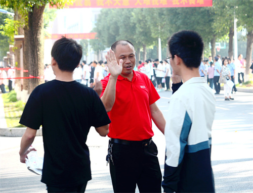 帶隊(duì)老師們身穿紅色上衣,寓意“開(kāi)門紅”,希望幫考生討個(gè)“好彩頭”。八點(diǎn)二十左右,考生需排隊(duì)進(jìn)入第一道安檢門。有的帶隊(duì)老師和學(xué)生擊掌鼓勁,有的帶隊(duì)老師帶領(lǐng)學(xué)生齊聲喊加油口號(hào),有的帶隊(duì)老師默默地陪著考生到最后進(jìn)場(chǎng)。