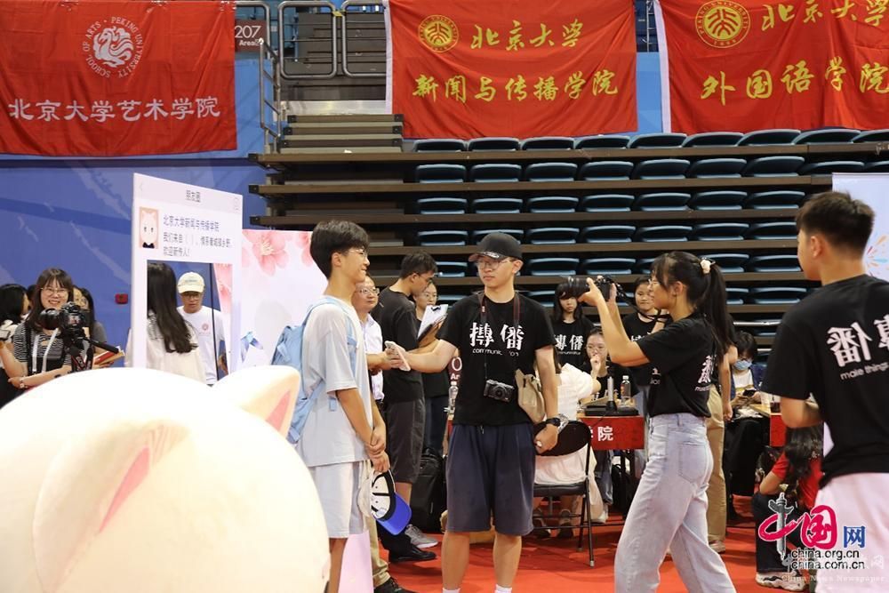 8月19日,北京大學邱德拔體育館,新生與學院的人偶、標識牌等進行合影留念。中國網(wǎng)記者 汪雅雯攝