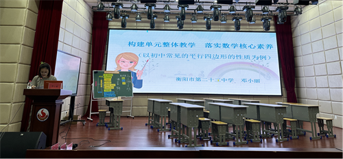9月21日下午,衡陽市第二十三中學劉瓊老師給大家?guī)砹艘惶蒙鷦拥臄祵W課——初中常見的四邊形的性質。課堂上的板書獨具匠心,師生的互動氣氛活躍,教師對知識點的歸納十分到位。隨后,衡陽市第二十三中學鄧小麗老師進行了點評,從“構建單元整體教學、落實數學核心素養(yǎng)”這一角度出發(fā),以四邊形為例,深刻剖析了單元重組的妙處。此外,衡陽市第二十三中學趙雙元老師給大家開展了以“核心素養(yǎng)導向的初中數學大單元教學設計策略”為主題的講座,令老師們受益匪淺。