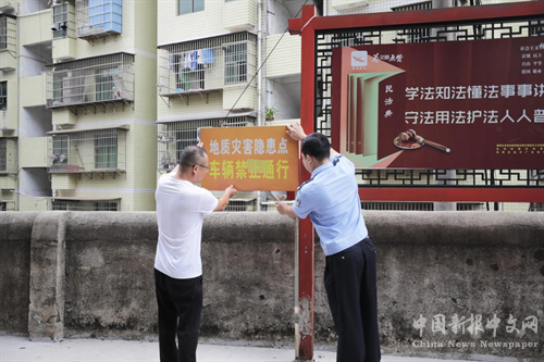 社區(qū)工作人員在地質(zhì)災(zāi)害隱患整改點(diǎn)進(jìn)行巡查并安裝警示牌。