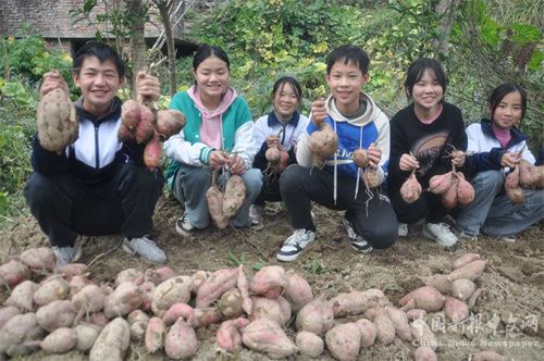 隆回高洲中學留守孩子“學農(nóng)基地”采挖紫薯樂陶陶