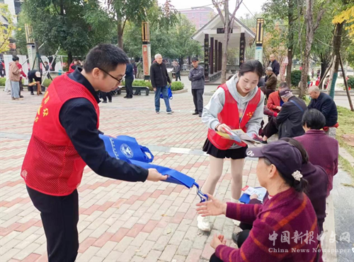 禁毒志愿者向居民發(fā)放宣傳資料。
