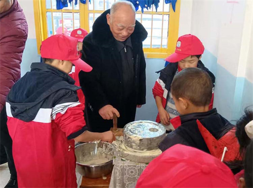 在研學(xué)基地,老教師劉期洪、手把手教學(xué)生推石磨磨豆?jié){:一是要按順時針方向推;二是用力要均勻;三是每推兩至三圈,將浸透的豆子從入料口倒入一小勺;老教師劉述倫指導(dǎo)學(xué)生敲洋鼓。勞動實踐區(qū),同學(xué)們在老專家劉茂春的指導(dǎo)下,認(rèn)真學(xué)習(xí)金銀花的嫁接方法和技巧,怎樣選枝和剪枝;還有通過打窩、下種、覆土、澆水播種實踐,孩子們迅速掌握了栽種蔬菜的技巧及養(yǎng)護(hù),大家分工協(xié)作、共育新苗,呈現(xiàn)出一派探索求知、辛勤勞作的景象。