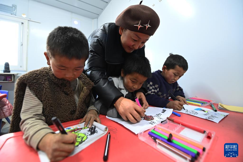 12月27日,在積石山縣大河家鎮(zhèn)梅坡小學(xué)臨時(shí)教學(xué)點(diǎn),老師指導(dǎo)小學(xué)生畫畫。