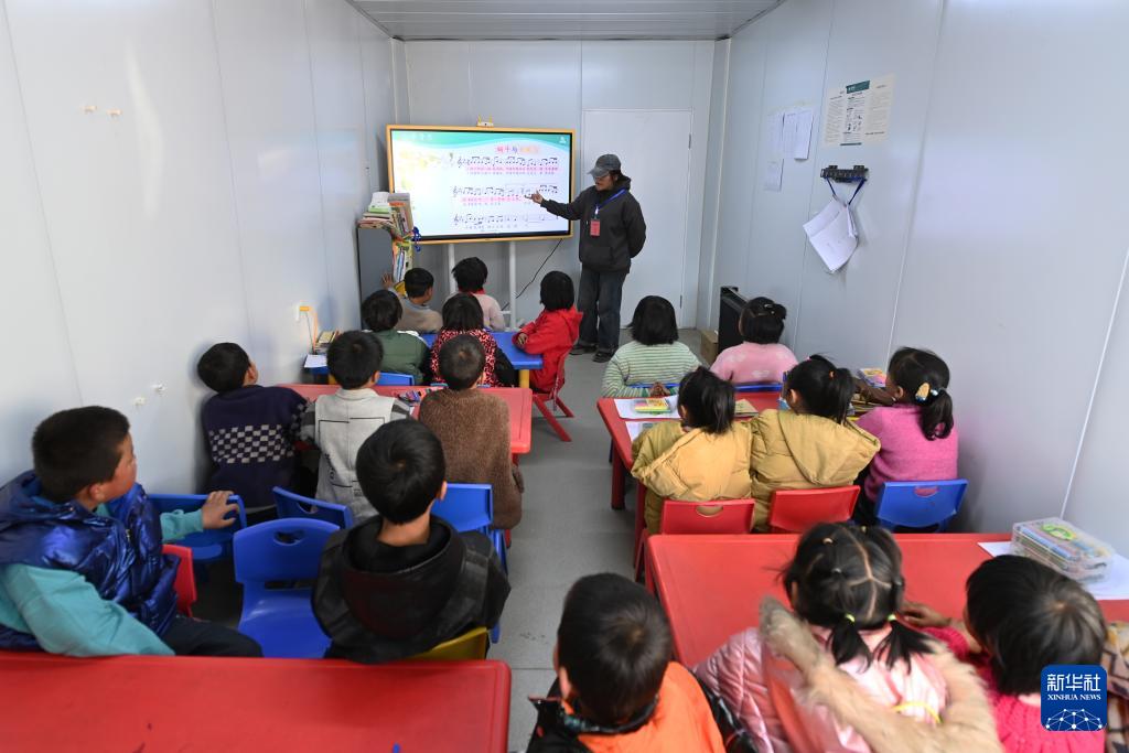 12月27日,在積石山縣大河家鎮(zhèn)梅坡小學(xué)臨時(shí)教學(xué)點(diǎn),老師給學(xué)生上音樂(lè)課。