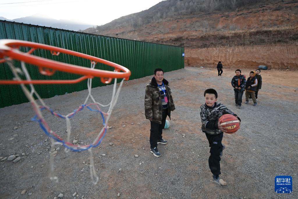 12月27日,在積石山縣大河家鎮(zhèn)梅坡小學(xué)臨時(shí)教學(xué)點(diǎn),學(xué)生在臨時(shí)操場(chǎng)打籃球。