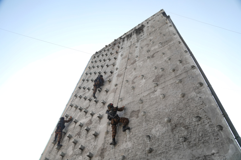 ↑武警特戰(zhàn)隊(duì)員進(jìn)行夾墻攀登訓(xùn)練