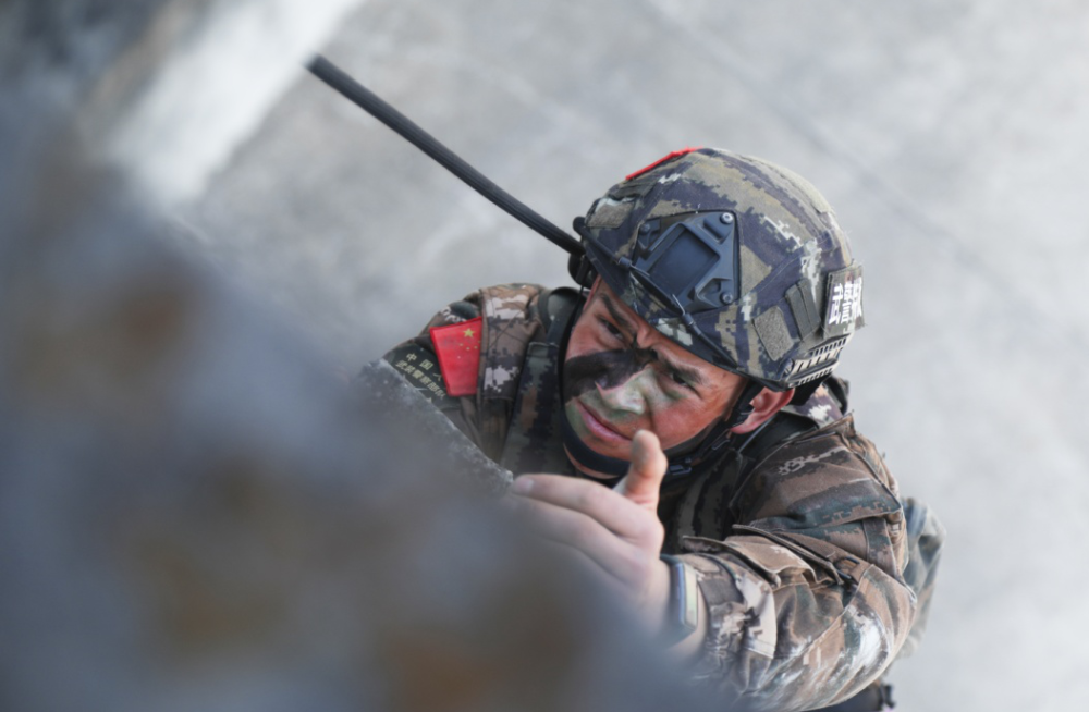 ↑武警特戰(zhàn)隊(duì)員進(jìn)行攀爬訓(xùn)練