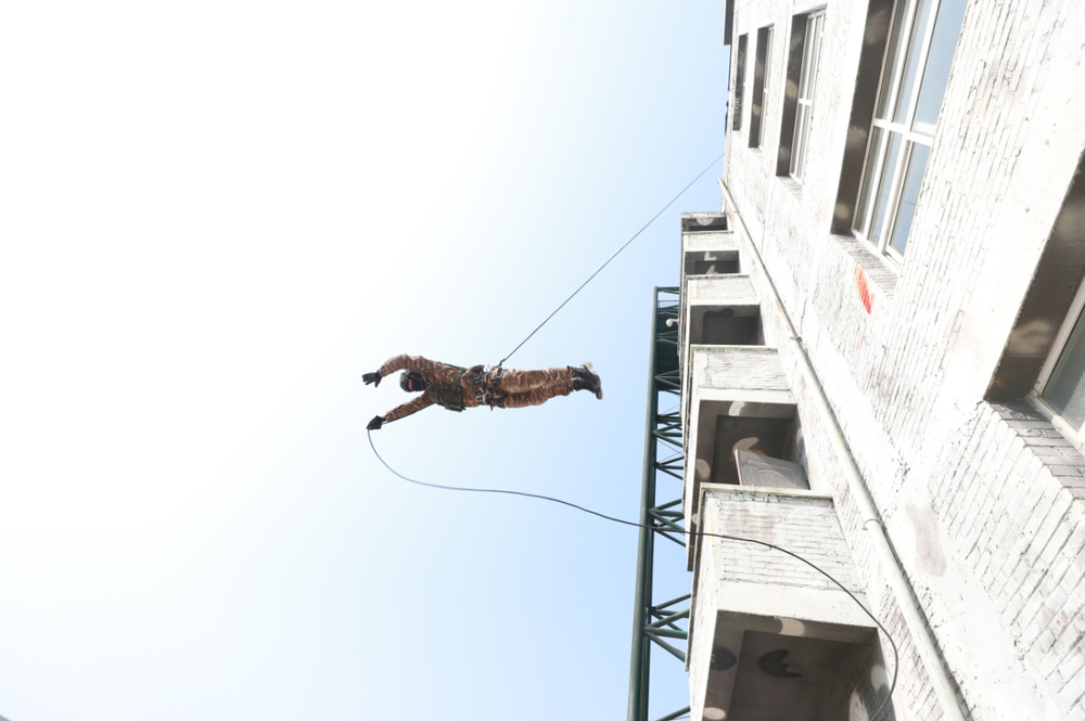 ↑武警特戰(zhàn)隊(duì)員進(jìn)行多種姿勢(shì)下滑訓(xùn)練
