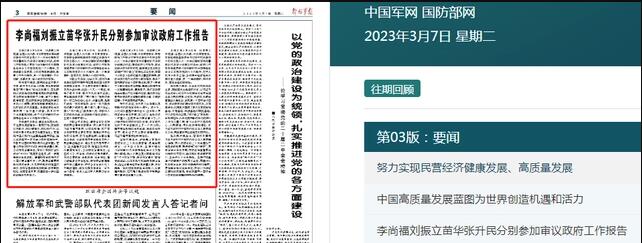 解放軍報(bào)3月7日?qǐng)?bào)道,人代會(huì)期間,李尚福、劉振立、苗華、張升民四位中央軍委委員分別參加審議政府工作報(bào)告。
