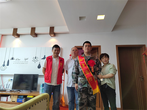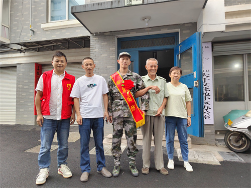 9月14日中午,在新兵和家人吃好入伍前的“最后一頓飯”后,東湖社區(qū)工作人員來(lái)到兩位新兵家中,為新兵帶上“光榮入伍”胸花,披上“獻(xiàn)身國(guó)防”綬帶,向支持國(guó)防建設(shè)的新兵家屬表示感謝,并向兩位新兵送上誠(chéng)摯的祝福,為新兵和家人拍下全家福留作紀(jì)念,隨后開車將兩位新兵送至海陽(yáng)鎮(zhèn)武裝部集合。
