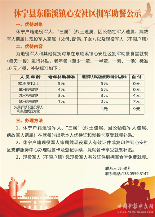 衣食住行,關乎冷暖。為扎實推動雙擁共建,在全社會持續(xù)營造尊崇軍人職業(yè)、尊重退役軍人的濃厚社會氛圍,11月22日,黃山市首家擁軍助餐食堂在休寧縣東臨溪鎮(zhèn)心安社區(qū)揭牌,讓現(xiàn)役軍人、退役軍人可享受優(yōu)惠食堂,獲得感成色更足、幸福感更有保障。