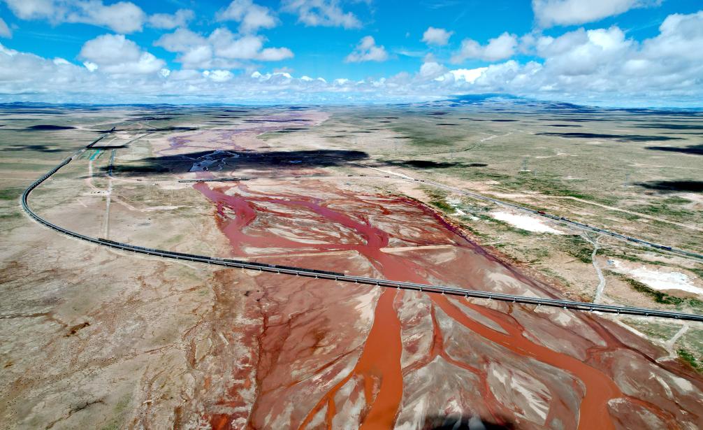 記者看到,在沱沱河與當曲匯合處的囊極巴隴,匯合后河流水量增大,辮狀河道寬度超過3千米。青藏鐵路楚瑪爾河大橋之下的楚瑪爾河,暗紅色的河水宛如大地的血管系統(tǒng),流淌在寬闊的辮狀河道里。