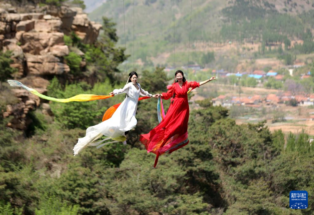 4月16日,游客在沂南縣紅石寨景區(qū)體驗高空威亞項目。