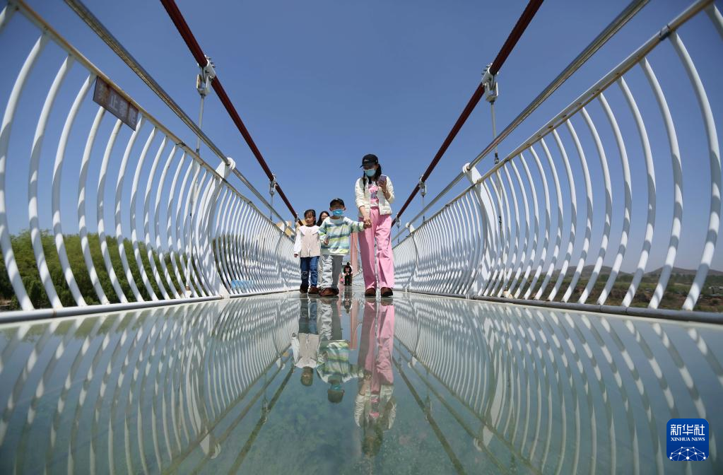 4月16日,游客在沂南縣紅石寨景區(qū)體驗高空玻璃吊橋。
