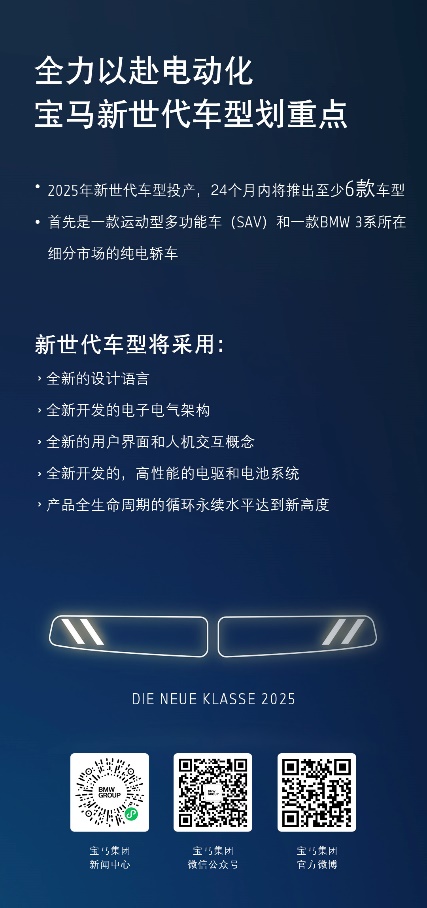 產(chǎn)品方面,寶馬接下來將“一鍵三連”發(fā)布創(chuàng)新純電動BMW i5、創(chuàng)新純電動BMW iX2以及創(chuàng)新純電動BMW i5旅行車。加上現(xiàn)有純電動車型,寶馬純電產(chǎn)品將幾乎覆蓋所有的主要細分市場。預(yù)計三年內(nèi)(截至2026年),純電動車型年銷量將占到集團全球銷量的三分之一。到2030年之前,集團全球年度銷量的50%以上將是純電動車型;屆時,集團累計交付的純電動車數(shù)量有望超過1000萬輛。