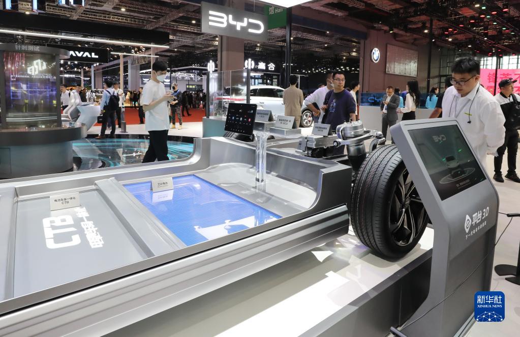 4月19日,參觀者在比亞迪汽車(chē)展臺(tái)觀看CTB電池車(chē)身一體化展示平臺(tái)。