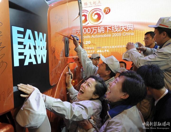 2009年10月20日,一汽解放的工人們在自己親手生產(chǎn)的2009年中國第1000萬輛車上簽名。新華社記者 蔣林 攝