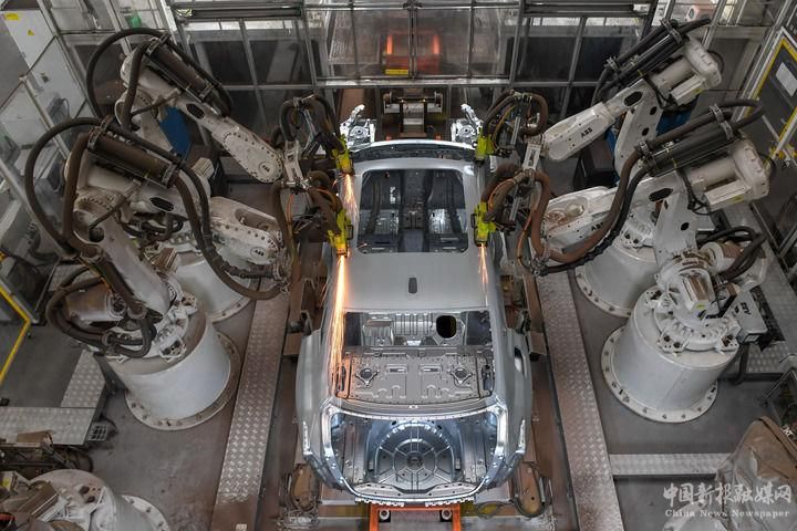 在位于吉林長春的一汽紅旗繁榮工廠焊裝車間內(nèi),機(jī)器人焊裝車輛零部件(2023年7月6日攝)。新華社記者 張楠 攝