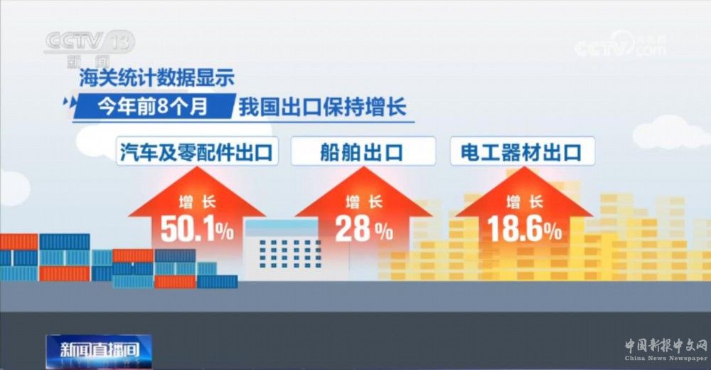 今年前8個(gè)月,我國(guó)出口保持增長(zhǎng)。其中,機(jī)電產(chǎn)品出口8.97萬(wàn)億元,同比增長(zhǎng)3.6%,占同期我國(guó)出口總值的58%;汽車及零配件出口、船舶出口、電工器材出口分別增長(zhǎng)50.1%、28%、18.6%。