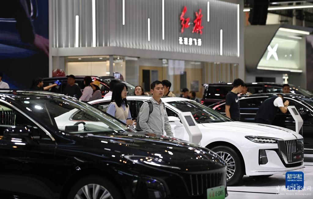 10月4日,參觀者在紅旗汽車展臺參觀。