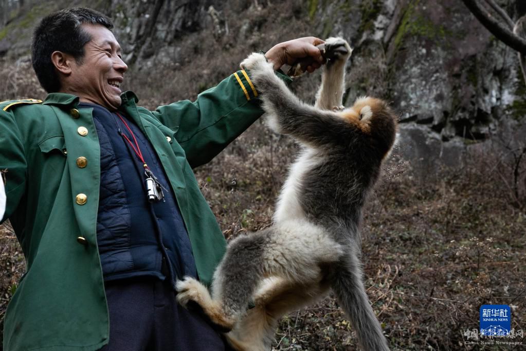 楊忠錄與大熊貓國家公園甘肅省片區(qū)裕河園區(qū)內(nèi)的川金絲猴互動(1月4日攝)。