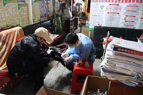 晚上7點多,受傷的白鷴被志愿者一行緊急送到新寧縣金石鎮(zhèn)春風(fēng)社區(qū)陳建軍衛(wèi)生室,陳醫(yī)生小心地為它清洗傷口,對鷴雞斷肢進行治療包扎固定。經(jīng)過將近一個小時的處理,鷴雞受傷骨折的那條腿才包扎固定好。